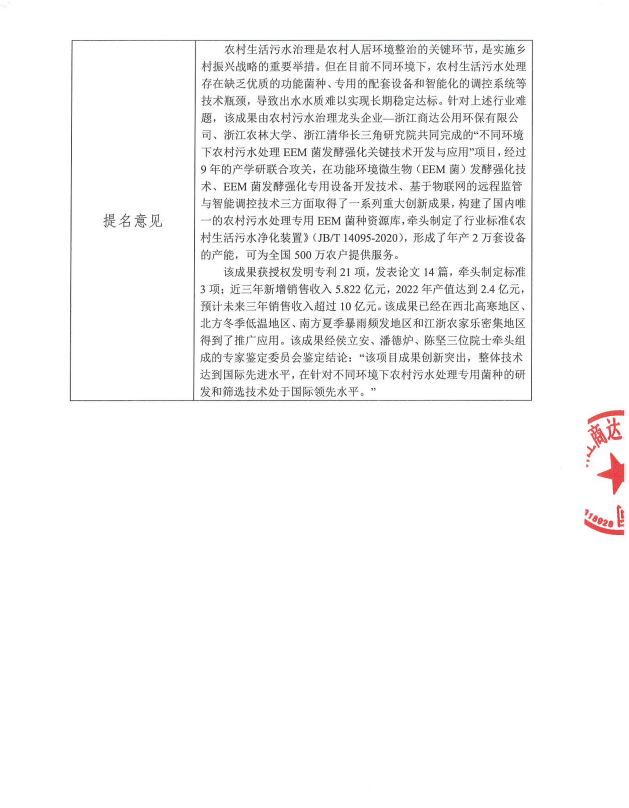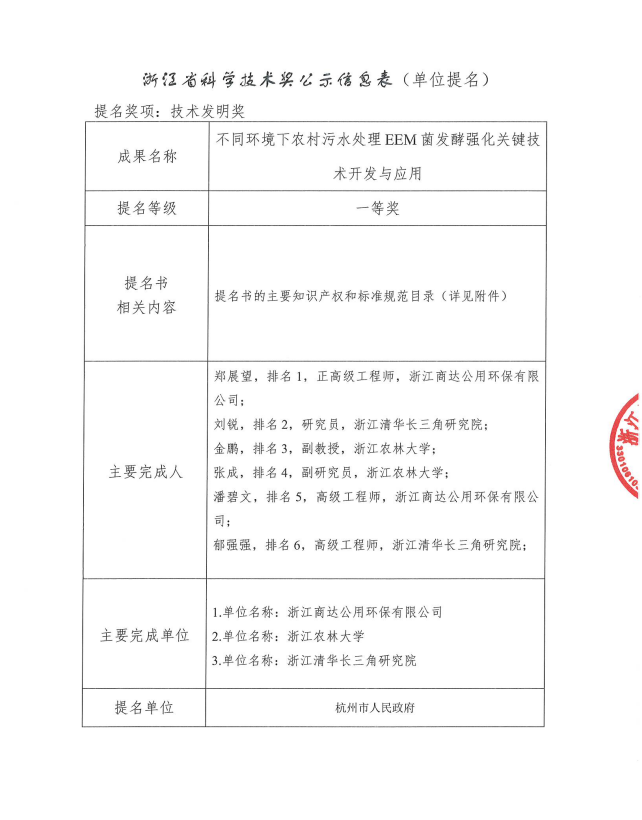 根據(jù)《浙江省科學技術廳關于開展2023年度浙江省科學技術獎提名工作的通知》要求,現(xiàn)對浙江商達公用環(huán)保有限公司參與的技術發(fā)明獎提名項目“不同環(huán)境下農(nóng)村污水處理EEM菌發(fā)酵強化關鍵技術開發(fā)與應用”予以公示。公示內(nèi)容包括成果名稱、提名等級、主要知識產(chǎn)權和標準規(guī)范目錄、主要完成人、主要完成單位、提名者及提名意見等。公示期為2024年08月08日至08月15日,共7天。公示期內(nèi),如任何個人或單位對公布的內(nèi)容持有異議,請向浙江商達公用環(huán)保有限公司反映。為便于核實查證,確保實事求是、公正地處理異議,提出異議的單位和個人應當標明真實身份,并提供相關的證據(jù)材料。凡匿名的異議和超出公示期限的異議,不予受理。