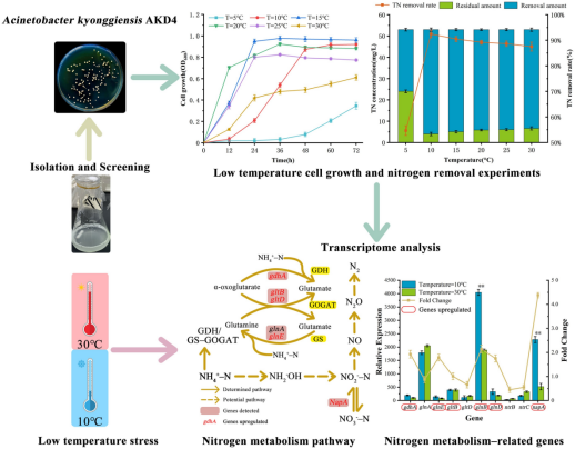 針對上述問題,本研究團隊分離并鑒定了一株鑒耐低溫同步硝化-反硝化細菌Acinetobacter kyonggiensis AKD4。在10℃和30℃下,總氮(TN)的去除率分別為92.45%和87.51%,具有良好的耐低溫性。并利用轉(zhuǎn)錄組技術(shù)分析揭示了低溫脅迫下可能的代謝機制。與在30℃培養(yǎng)下相比,參與細胞生長的基因,包括ATP合成酶(atpADGH)、氨基酸(glyA、dctA和ilvE)和TCA循環(huán)代謝(gltA、fumC和mdh)在10℃下顯著上調(diào)1.05 - 3.44倍,表明它們的作用增強了低溫下的生存能力。與氮同化(glnAE、gltBD和gdhA)、氮代謝調(diào)節(jié)(ntrC、glnB和glnD)和反硝化過程(napA)相關(guān)的基因表達量在10℃下增加了1.01 - 4.38倍,這可能是細菌在低溫下高效脫氮的原因??偟膩碚f,該研究為我國低溫條件下設(shè)施漁業(yè)和農(nóng)村污水高效處理提供了新的菌種資源,并增強了對同步硝化和反硝化過程的耐低溫機制的理解。
