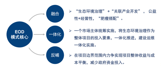 生態(tài)價值化EOD模式是“綠水青山就是金山銀山”理念在項目運作中的應(yīng)用,可推動生態(tài)環(huán)境治理與關(guān)聯(lián)產(chǎn)業(yè)融合,實現(xiàn)生態(tài)價值轉(zhuǎn)化,提升生態(tài)環(huán)境治理項目造血功能,降低政府投資。