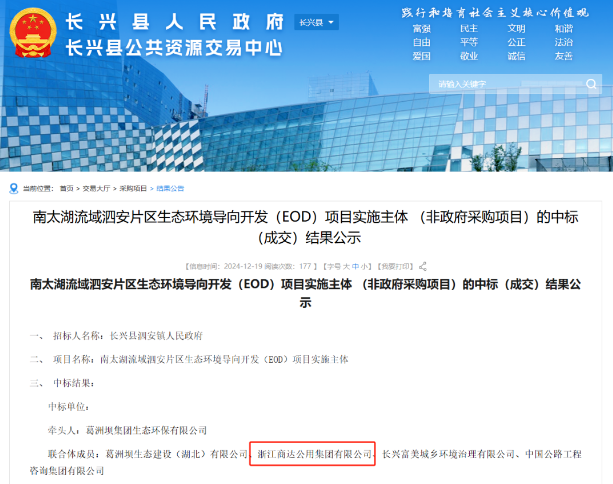 商達(dá)公用集團(tuán)中標(biāo)長(zhǎng)興南太湖流域泗安片區(qū)生態(tài)環(huán)境導(dǎo)向開(kāi)發(fā)(EOD)項(xiàng)目