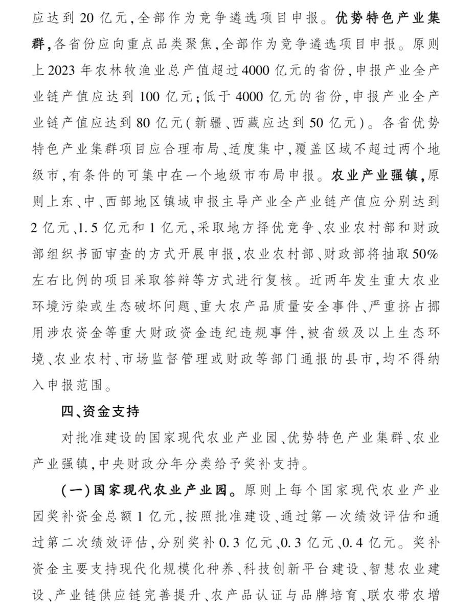 1.國家現(xiàn)代農(nóng)業(yè)產(chǎn)業(yè)園全部作為競爭遴選項(xiàng)目申報,優(yōu)勢特色產(chǎn)業(yè)集群全部作為競爭遴選項(xiàng)目申報,農(nóng)業(yè)產(chǎn)業(yè)強(qiáng)鎮(zhèn)采取地方擇優(yōu)競爭、農(nóng)業(yè)農(nóng)村部和財政部組織書面審查的方式開展申報。