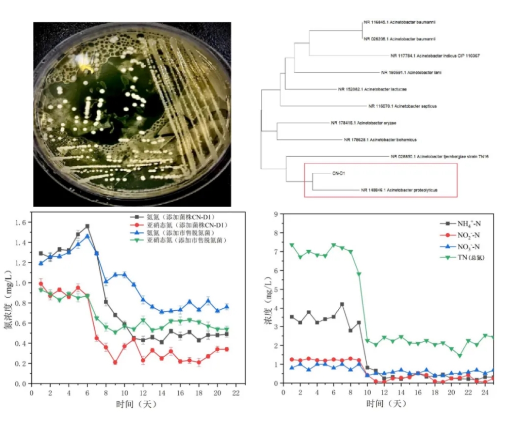 針對上述問題,研究團隊分離并鑒定了一株不動桿菌(Acinetobacter sp.)CN-D1菌株,保藏編號為CCTCC NO:M 20242023。CN-D1是一種同步硝化反硝化菌,能夠同時除去水體中的總氮、氨氮、亞硝酸鹽等物質(zhì);同時環(huán)境耐受性強,可以應(yīng)用于循環(huán)養(yǎng)殖水體和養(yǎng)殖尾水中,發(fā)揮生物脫氮的作用。在實際應(yīng)用中,循環(huán)水養(yǎng)殖系統(tǒng)中投加CN-D1菌劑后,水體中的氨氮和亞硝態(tài)氮的去除率分別可以達到70.8% 和69.2%。針對尾水中的高濃度污染物(NH4+-N 3.5 mg/L、TN 6.9 mg/L),連續(xù)投加菌劑后10天內(nèi),各項指標均大幅下降,穩(wěn)定時的NH4+-N、NO??-N以及TN的去除率分別可以達到86.5%、81.7%和71.0%??偟膩碚f,該研究為我國循環(huán)水養(yǎng)殖系統(tǒng)水處理提供了新的菌種資源,有效減少循環(huán)水養(yǎng)殖系統(tǒng)水處理的成本。