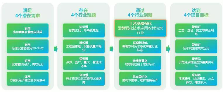 農(nóng)村污水治理4.0農(nóng)村污水治理4.0是一個(gè)系統(tǒng),其內(nèi)涵概況起來(lái),主要包含了4個(gè)“4”,分別為滿足4個(gè)潛在需求、存在4個(gè)行業(yè)難題、通過(guò)4個(gè)行業(yè)創(chuàng)新、達(dá)到4個(gè)項(xiàng)目目標(biāo),最終要達(dá)到的是提升村民獲得感,也是農(nóng)村人居環(huán)境建設(shè)的出發(fā)點(diǎn)和落腳點(diǎn)。