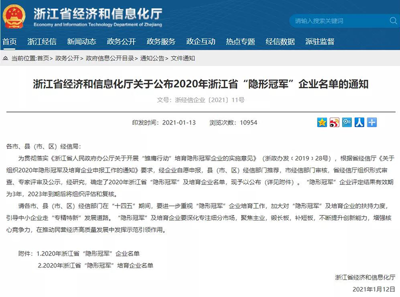 浙江省“隱形冠軍”企業(yè)是由浙江省人民政府辦公廳組織開展的一項評選活動,從產(chǎn)品市場占有率、產(chǎn)品創(chuàng)新性、生產(chǎn)技術水平、企業(yè)持續(xù)創(chuàng)新能力等方面打分,對企業(yè)有著嚴格要求。主要產(chǎn)品在行業(yè)內(nèi)具有優(yōu)良信譽,且市場占有率位于全國前5位或全省前3位;企業(yè)研發(fā)經(jīng)費支出占營業(yè)收入的比重不低于3%;相關關鍵性能指標處于國際同類產(chǎn)品的領先水平。