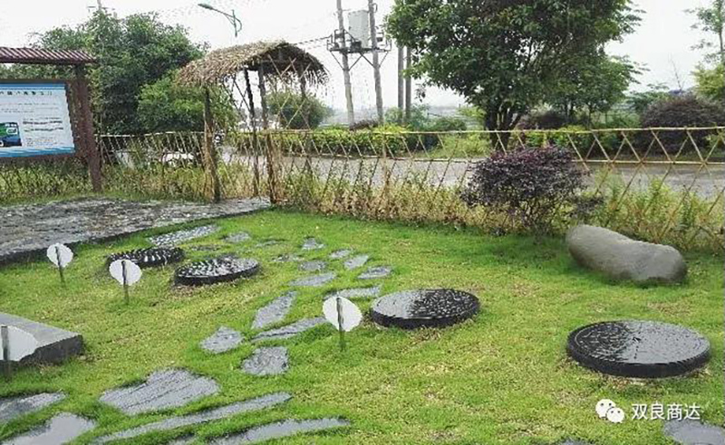 指南村探索將前段水(含有N,P等營養(yǎng)物質)經(jīng)過處理后達到《農田灌溉水質標準》用于噴灌。上圖就是百草園的噴灌設施。一方面解決了村落景區(qū)夏季水量大的問題,從而減輕了系統(tǒng)負荷,降低處理成本的同時提高系統(tǒng)達標率。另外一方面也為中草藥等農作物提供了有機養(yǎng)分。