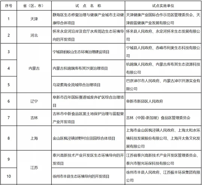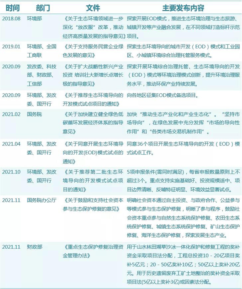 2021年4月,生態(tài)環(huán)境部、發(fā)改委和國開行聯(lián)合印發(fā)《關(guān)于同意開展生態(tài)環(huán)境導(dǎo)向的開發(fā)(EOD)模式試點的通知》,集中梳理天津、河北、內(nèi)蒙古等20個?。▍^(qū)、市)的36個典型意義試點項目,主要涉及流域治理、生態(tài)農(nóng)業(yè)、礦山修復(fù)、沙漠治理、“無廢城市”等。