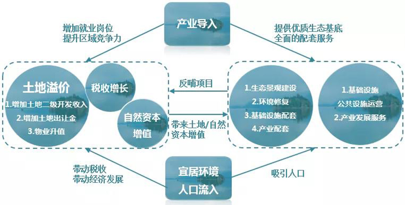 總結(jié)來說,EOD項目操作模式就是通過生態(tài)網(wǎng)絡(luò)建設(shè)、環(huán)境修復(fù)、基礎(chǔ)設(shè)施配套以及產(chǎn)業(yè)配套建設(shè)促使該區(qū)域及周邊的土地升值,并為產(chǎn)業(yè)引入和人口流入提供良好的生態(tài)基底;一方面以產(chǎn)業(yè)發(fā)展增加居民收入、企業(yè)的利潤和政府的稅收;另一方面依靠人口流入帶來政府稅收的增加及區(qū)域經(jīng)濟的發(fā)展。最終實現(xiàn)生態(tài)建設(shè)、經(jīng)濟發(fā)展、社會生活三者協(xié)調(diào)發(fā)展。