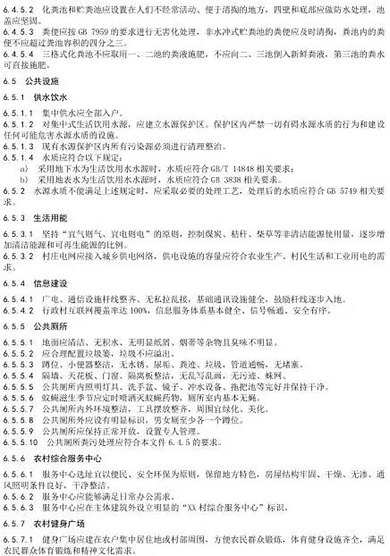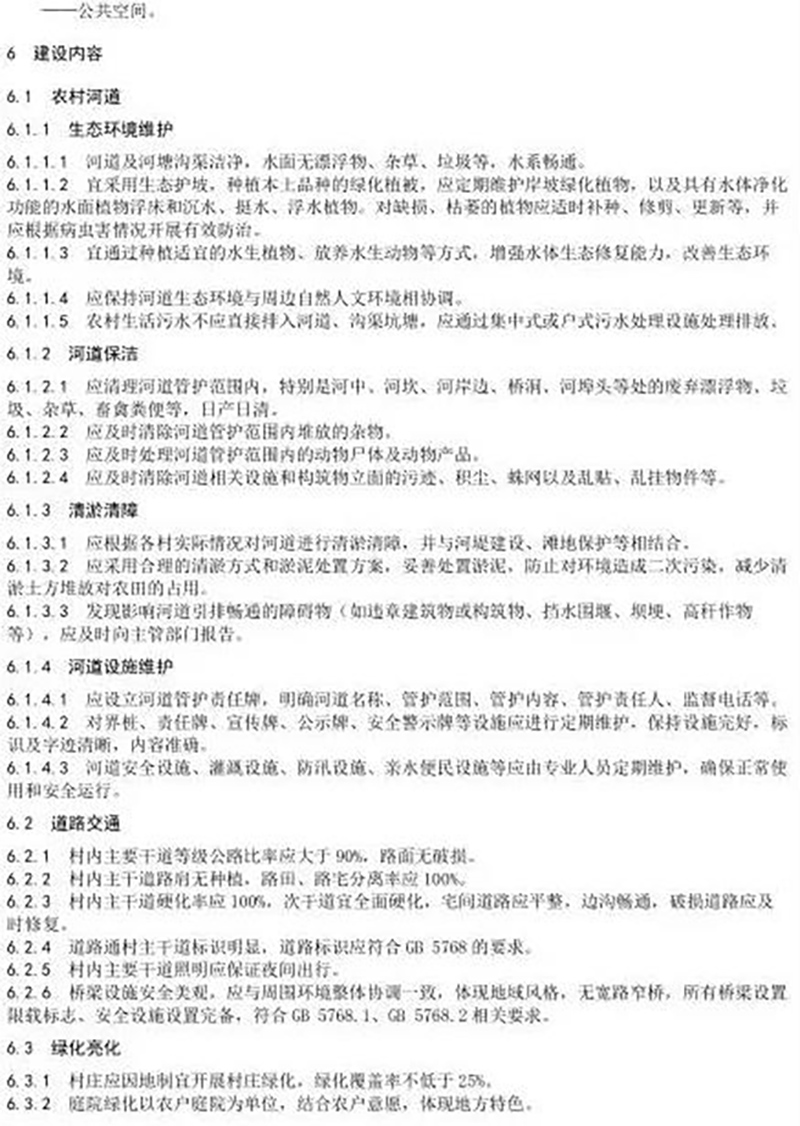 細(xì)化建設(shè)標(biāo)準(zhǔn)。圍繞農(nóng)村人居環(huán)境建設(shè)中包含的農(nóng)村河道、道路交通、綠化亮化、環(huán)境保潔、公共設(shè)施、公共空間等六項(xiàng)重點(diǎn)管護(hù)內(nèi)容,逐一細(xì)化標(biāo)準(zhǔn),反復(fù)征求意見,使管護(hù)內(nèi)容有標(biāo)準(zhǔn)、可操作、能量化。農(nóng)村河道管護(hù)涵蓋生態(tài)環(huán)境維護(hù)、河道保潔、清淤清障、河道設(shè)施維護(hù)等內(nèi)容;道路交通管護(hù)涵蓋主次干道、橋梁設(shè)施、路道修復(fù)、安全設(shè)施等內(nèi)容;綠化亮化管護(hù)涵蓋庭院綠、路渠綠化、農(nóng)田林網(wǎng)建設(shè)、公共照明等內(nèi)容;環(huán)境保潔管護(hù)涵蓋畜禽養(yǎng)殖、生活垃圾、建筑垃圾、戶廁衛(wèi)生、糞污處理等內(nèi)容,公共設(shè)施管護(hù)涵蓋供水飲水、生活用能、信息建設(shè)、公共廁所、農(nóng)村綜合服務(wù)中心、農(nóng)村健身廣場等內(nèi)容;公共空間管護(hù)涵蓋公共停車場、文化墻、公告欄、村容村貌、招牌廣告等內(nèi)容。