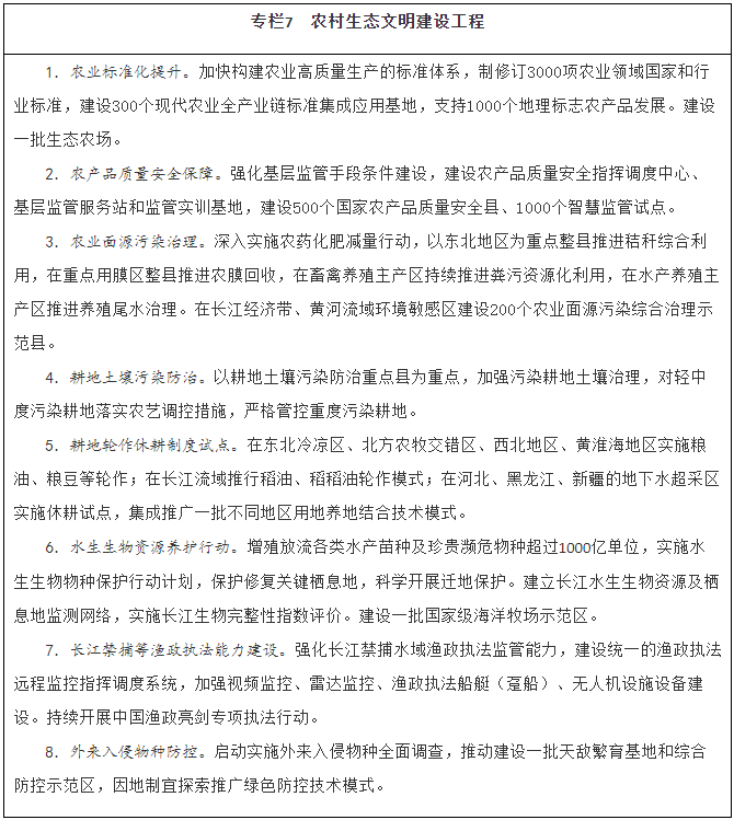 推進重點區(qū)域生態(tài)環(huán)境保護。全面實施長江流域重點水域十年禁漁,推進以長江為重點的漁政執(zhí)法能力建設(shè),做好退捕漁民安置保障工作。推進長江水生生物資源和水域生態(tài)保護修復(fù),實施中華鱘、長江江豚、長江鱘拯救行動計劃。開展長江、黃河流域農(nóng)業(yè)面源污染治理,實施深度節(jié)水控水行動。建立生態(tài)產(chǎn)品價值實現(xiàn)機制,在長江流域等開展試點。