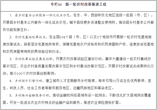 深化農(nóng)村集體產(chǎn)權(quán)制度改革,完善產(chǎn)權(quán)權(quán)能,將經(jīng)營性資產(chǎn)量化到集體經(jīng)濟組織成員,有效盤活集體資產(chǎn)資源,發(fā)展壯大新型農(nóng)村集體經(jīng)濟。開展集體經(jīng)營性資產(chǎn)股份自愿有償退出試點。深化供銷合作社綜合改革。深入推進農(nóng)墾墾區(qū)集團化、農(nóng)場企業(yè)化改革,加強農(nóng)墾國有農(nóng)用地保護、管理和合理利用。繼續(xù)深化集體林權(quán)、國有林區(qū)林場、草原承包經(jīng)營制度改革。扎實推進農(nóng)村綜合改革。推動農(nóng)村改革試驗區(qū)集成創(chuàng)新,拓展試驗內(nèi)容,發(fā)揮好先行先試、示范引領(lǐng)作用。