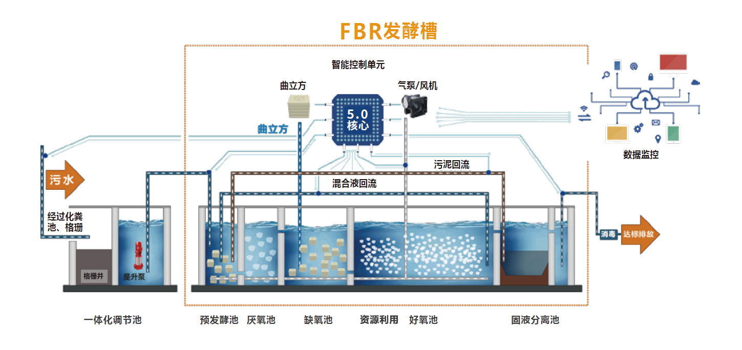 FBR發(fā)酵槽引入預(yù)發(fā)酵概念,設(shè)備生化段增加預(yù)發(fā)酵池,增加發(fā)酵槽內(nèi)微生物濃度,強(qiáng)化功能微生物活性,解決農(nóng)村污水低碳氮比環(huán)境下除磷脫氮的行業(yè)難題??蓽p少因水質(zhì)、水量、溫度等外界因素變化對(duì)生物處理效率的影響,大幅提高出水達(dá)標(biāo)率。