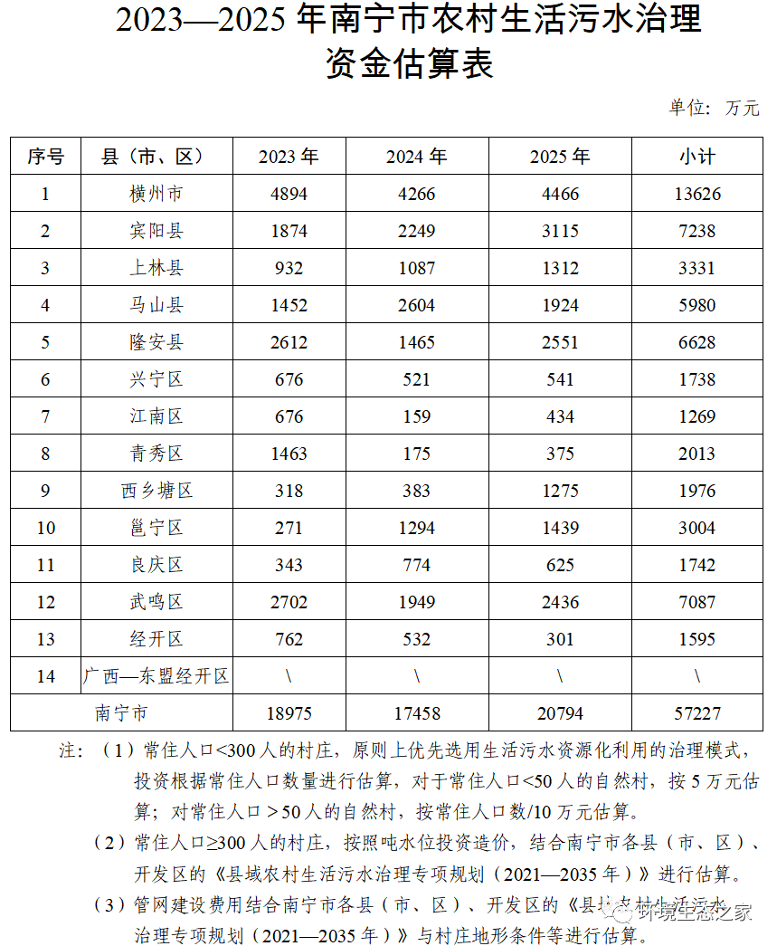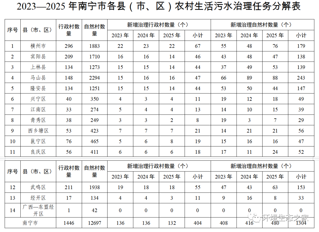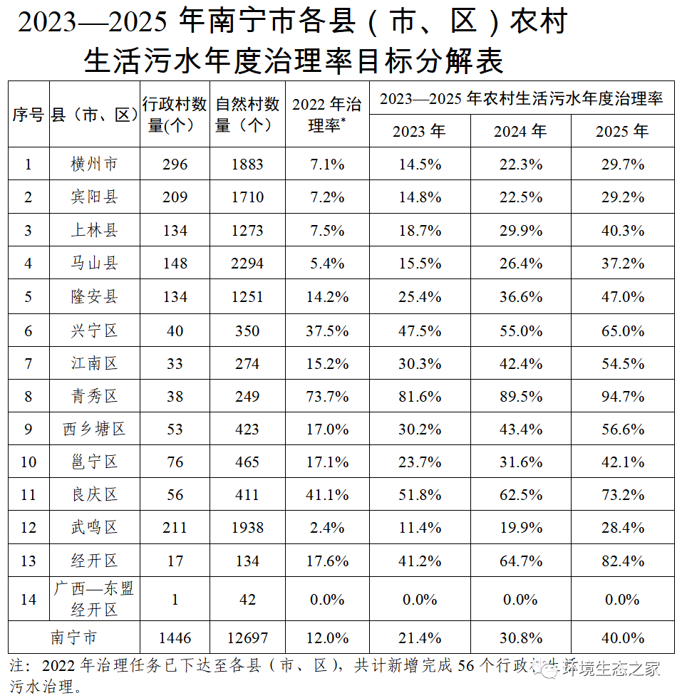 根據(jù)國(guó)家及自治區(qū)最新要求,加快提升南寧市農(nóng)村生活污水治理水平,2023—2025年完成404個(gè)行政村農(nóng)村生活污水治理,到2025年全市農(nóng)村生活污水治理率達(dá)到40%。