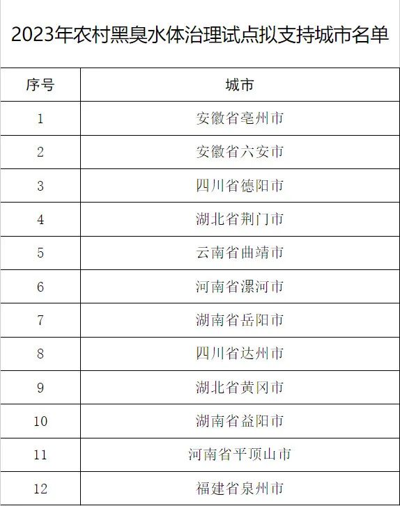2023年5月19日,財(cái)政部官網(wǎng)公示2023年農(nóng)村黑臭水體治理試點(diǎn)支持城市名單,共12個(gè)城市,公示期從5月19日至5月26日。詳情如下:2023年農(nóng)村黑臭水體治理試點(diǎn)支持城市名單公示按照《財(cái)政部辦公廳 生態(tài)環(huán)境部辦公廳關(guān)于開(kāi)展2023年農(nóng)村黑臭水體治理試點(diǎn)工作的通知》(財(cái)辦資環(huán)〔2023〕8號(hào))要求,財(cái)政部會(huì)同生態(tài)環(huán)境部組織專(zhuān)家對(duì)各地農(nóng)村黑臭水體治理申報(bào)城市實(shí)施方案進(jìn)行了競(jìng)爭(zhēng)性評(píng)審,并將12個(gè)城市確定為2023年支持的農(nóng)村黑臭水體治理試點(diǎn)城市(詳見(jiàn)附件)。現(xiàn)將結(jié)果予以公示,公示期從5月19日至5月26日。如有意見(jiàn),請(qǐng)以書(shū)面(實(shí)名)形式反饋財(cái)政部自然資源和生態(tài)環(huán)境司、生態(tài)環(huán)境部土壤生態(tài)環(huán)境司。附件:2023年農(nóng)村黑臭水體治理試點(diǎn)擬支持城市名單聯(lián)系電話(huà):010-61965527 010-65645718財(cái)政部自然資源和生態(tài)環(huán)境司 生態(tài)環(huán)境部土壤生態(tài)環(huán)境司2023年5月19日
