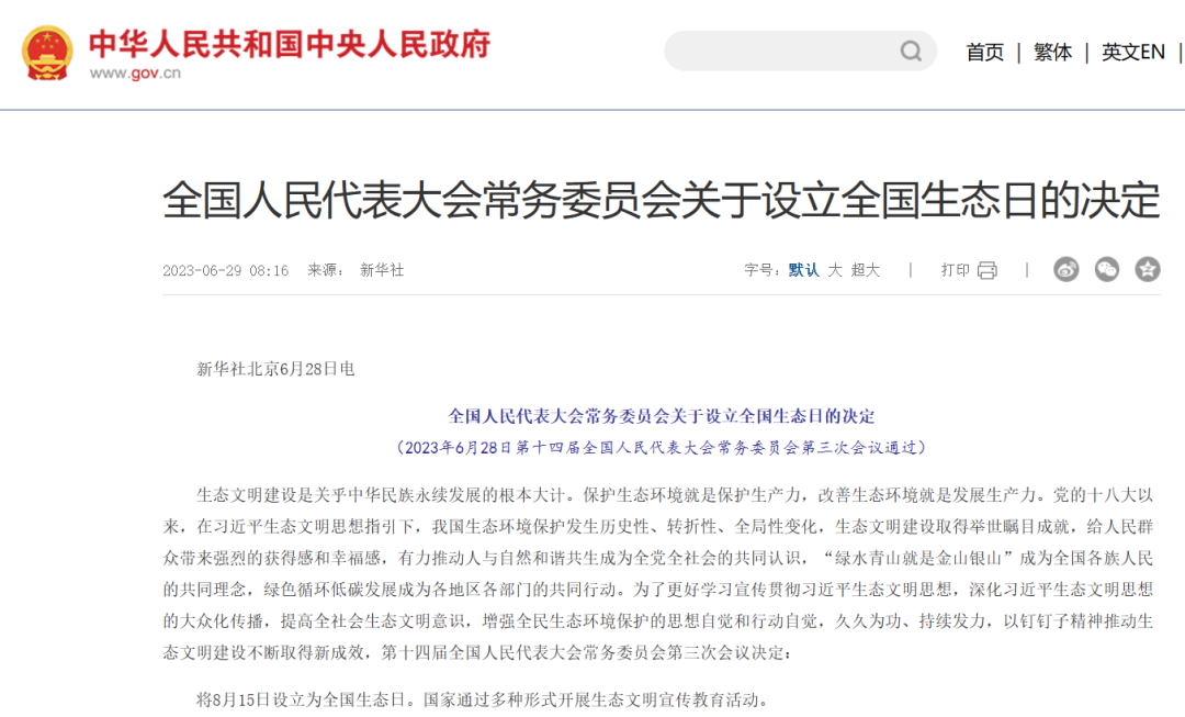 2023年8月15日,是我國首個(gè)全國生態(tài)日。這一天,也是習(xí)近平總書記在浙江安吉考察時(shí)首次提出“綠水青山就是金山銀山”的科學(xué)論斷的紀(jì)念日。這一論斷是習(xí)近平生態(tài)文明思想的核心理念,也是指導(dǎo)中國生態(tài)文明建設(shè)的重要原則。全國生態(tài)日的由來全國生態(tài)日的設(shè)立是由浙江省人大代表團(tuán)提出的議案,經(jīng)過全國人大常委會(huì)審議通過。這是我國第一個(gè)以決定形式設(shè)立的綜合性活動(dòng)日,也是我國第一個(gè)以“全國”命名的活動(dòng)日。將8月15日設(shè)立為全國生態(tài)日,比較符合確定紀(jì)念日、活動(dòng)日時(shí)間的基本原則,能夠充分體現(xiàn)首創(chuàng)性、標(biāo)志性、獨(dú)特性。8月15日正是習(xí)近平總書記在浙江工作期間,2005年考察湖州市安吉縣時(shí)首次提出“綠水青山就是金山銀山”的科學(xué)論斷。這一論斷是習(xí)近平生態(tài)文明思想的核心理念。習(xí)近平總書記曾多次強(qiáng)調(diào),“綠水青山就是金山銀山”不僅是一種理念,更是一種行動(dòng)。全國生態(tài)日的目的全國生態(tài)日的主要目的是更好地學(xué)習(xí)宣傳貫徹習(xí)近平生態(tài)文明思想,深化習(xí)近平生態(tài)文明思想的大眾化傳播,提高全社會(huì)生態(tài)文明意識(shí),增強(qiáng)全民生態(tài)環(huán)境保護(hù)的思想自覺和行動(dòng)自覺,久久為功、持續(xù)發(fā)力,以釘釘子精神推動(dòng)生態(tài)文明建設(shè)不斷取得新成效。習(xí)近平總書記指出,“建設(shè)美麗中國、實(shí)現(xiàn)中華民族偉大復(fù)興,需要我們一代代人接力奮斗”。 全國生態(tài)日的設(shè)立,有利于激發(fā)全社會(huì)對(duì)美麗中國建設(shè)的責(zé)任感和使命感,引導(dǎo)廣大人民群眾積極參與到生態(tài)文明建設(shè)中來,形成人與自然和諧共生、共同發(fā)展、共享未來的良好局面。全國生態(tài)日的內(nèi)容全國生態(tài)日的主要內(nèi)容是通過多種形式開展生態(tài)文明宣傳教育活動(dòng),包括舉辦主題宣傳活動(dòng)、開展環(huán)境保護(hù)志愿服務(wù)、組織生態(tài)文明知識(shí)競賽、展示生態(tài)文明建設(shè)成果、推廣綠色低碳生活方式等。全國生態(tài)日的首次實(shí)施將于2023年8月15日開始,屆時(shí)將有一系列相關(guān)活動(dòng)舉行。首個(gè)全國生態(tài)日,國家發(fā)展改革委將會(huì)同中央宣傳部、自然資源部、生態(tài)環(huán)境部等部門和浙江省人民政府在浙江省湖州市舉辦首個(gè)全國生態(tài)日主場(chǎng)活動(dòng)。此外,還將有各地區(qū)各部門各單位根據(jù)實(shí)際情況,開展各具特色的生態(tài)文明宣傳教育活動(dòng),讓全國生態(tài)日成為一場(chǎng)全民參與、共同學(xué)習(xí)、共同行動(dòng)的生態(tài)文明盛會(huì)。全國生態(tài)日標(biāo)識(shí)(全國生態(tài)日標(biāo)識(shí),來源:國家發(fā)改委)