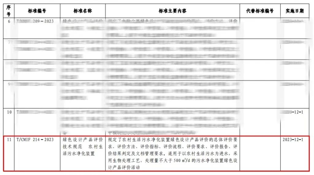 2023年10月10日,中國機械工業(yè)聯(lián)合會發(fā)布2023年第4號公告,批準17項中國機械工業(yè)聯(lián)合會團體標準。由商達公用起草主編的T/CMIF 214-2023《綠色設計產品評價技術規(guī)范 農村生活污水凈化裝置》名列榜單,自2023年12月1日起實施。
