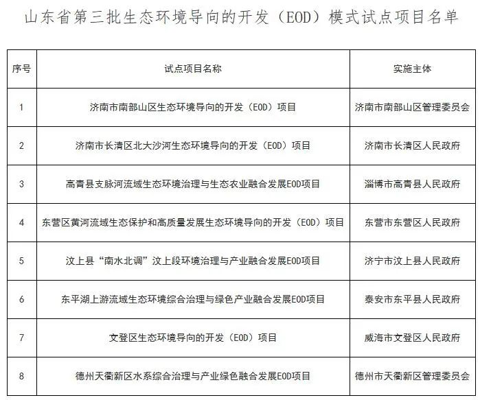?10月17日,山東省生態(tài)環(huán)境廳發(fā)布《關(guān)于同意開展第三批省級生態(tài)環(huán)境導(dǎo)向的開發(fā)(EOD)模式試點的通知》,經(jīng)研究,同意濟(jì)南市南部山區(qū)生態(tài)環(huán)境導(dǎo)向的開發(fā)(EOD)項目等8個項目(名單見附件)開展省級生態(tài)環(huán)境導(dǎo)向的開發(fā)(EOD)模式試點工作,期限為3年。關(guān)于同意開展第三批省級生態(tài)環(huán)境導(dǎo)向的開發(fā)(EOD)模式試點的通知魯環(huán)字〔2023〕130號濟(jì)南、淄博、東營、濟(jì)寧、泰安、威海、德州市生態(tài)環(huán)境局、發(fā)展改革委,人民銀行淄博、東營、濟(jì)寧、泰安、威海、德州市分行,各試點實施單位:為深入推進(jìn)我省生態(tài)環(huán)境治理體系和治理能力現(xiàn)代化,提升生態(tài)環(huán)保產(chǎn)業(yè)發(fā)展水平,創(chuàng)新環(huán)境治理模式,根據(jù)《關(guān)于推薦第三批生態(tài)環(huán)境導(dǎo)向的開發(fā)(EOD)模式試點項目的通知》(魯環(huán)字〔2023〕70號)要求,經(jīng)研究,同意濟(jì)南市南部山區(qū)生態(tài)環(huán)境導(dǎo)向的開發(fā)(EOD)項目等8個項目(名單見附件)開展省級生態(tài)環(huán)境導(dǎo)向的開發(fā)(EOD)模式試點工作,期限為3年?,F(xiàn)將有關(guān)事項通知如下。一、切實推進(jìn)試點項目實施。各試點實施單位要嚴(yán)格貫徹落實國家和省有關(guān)生態(tài)環(huán)境治理模式創(chuàng)新和生態(tài)環(huán)保產(chǎn)業(yè)發(fā)展的要求,在試點工作開展過程中積極探索,創(chuàng)新生態(tài)環(huán)境治理項目組織實施方式,促進(jìn)生態(tài)環(huán)境高水平保護(hù)和區(qū)域經(jīng)濟(jì)高質(zhì)量發(fā)展。各市生態(tài)環(huán)境局、發(fā)展改革委要加強對試點工作督促指導(dǎo),及時糾正試點工作中發(fā)現(xiàn)的問題,推進(jìn)試點工作規(guī)范實施,國家開發(fā)銀行山東省分行將按照精準(zhǔn)施策、市場化運作和風(fēng)險可控的原則,在資源配置上予以傾斜,加大支持力度。二、依法依規(guī)開展試點工作。各試點實施單位是試點工作的責(zé)任主體,要嚴(yán)格按照有關(guān)要求開展試點工作,不得以試點名義突破現(xiàn)有法律法規(guī)政策等要求,不得以試點名義代替項目立項等程序,不得增加地方隱性債務(wù)。三、強化試點項目收益反哺機(jī)制。各試點實施單位要加強公益性生態(tài)環(huán)境治理項目與相關(guān)經(jīng)營性產(chǎn)業(yè)開發(fā)項目一體化融合實施。實施過程中可適當(dāng)優(yōu)化試點依托項目,加大對生態(tài)環(huán)境治理的反哺力度。四、加強試點經(jīng)驗總結(jié)。各試點實施單位要加強統(tǒng)籌,及時總結(jié)經(jīng)驗做法,探索形成可復(fù)制、可推廣的生態(tài)環(huán)境治理創(chuàng)新模式。試點期內(nèi)每年12月底前將年度進(jìn)展情況報市生態(tài)環(huán)境局、發(fā)展改革委審查后,由兩部門上報省生態(tài)環(huán)境廳、發(fā)展改革委,同時抄報人民銀行山東省分行、國開行山東省分行。附件:山東省第三批生態(tài)環(huán)境導(dǎo)向的開發(fā)(EOD)模式試點項目名單