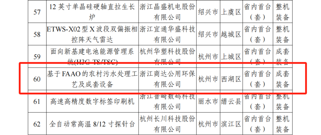 2023年12月31日,浙江省經(jīng)濟(jì)和信息化廳公布《2023年度浙江省首臺(tái)(套)裝備名單》,確定2023年度浙江省首臺(tái)(套)裝備292項(xiàng),其中國際首臺(tái)(套)裝備3項(xiàng)、國內(nèi)首臺(tái)(套)裝備53項(xiàng)、省內(nèi)首臺(tái)(套)裝備236項(xiàng)。商達(dá)公用“基于FAAO的農(nóng)村污水處理工藝成套設(shè)備”成功認(rèn)定浙江省首臺(tái)(套)裝備。
