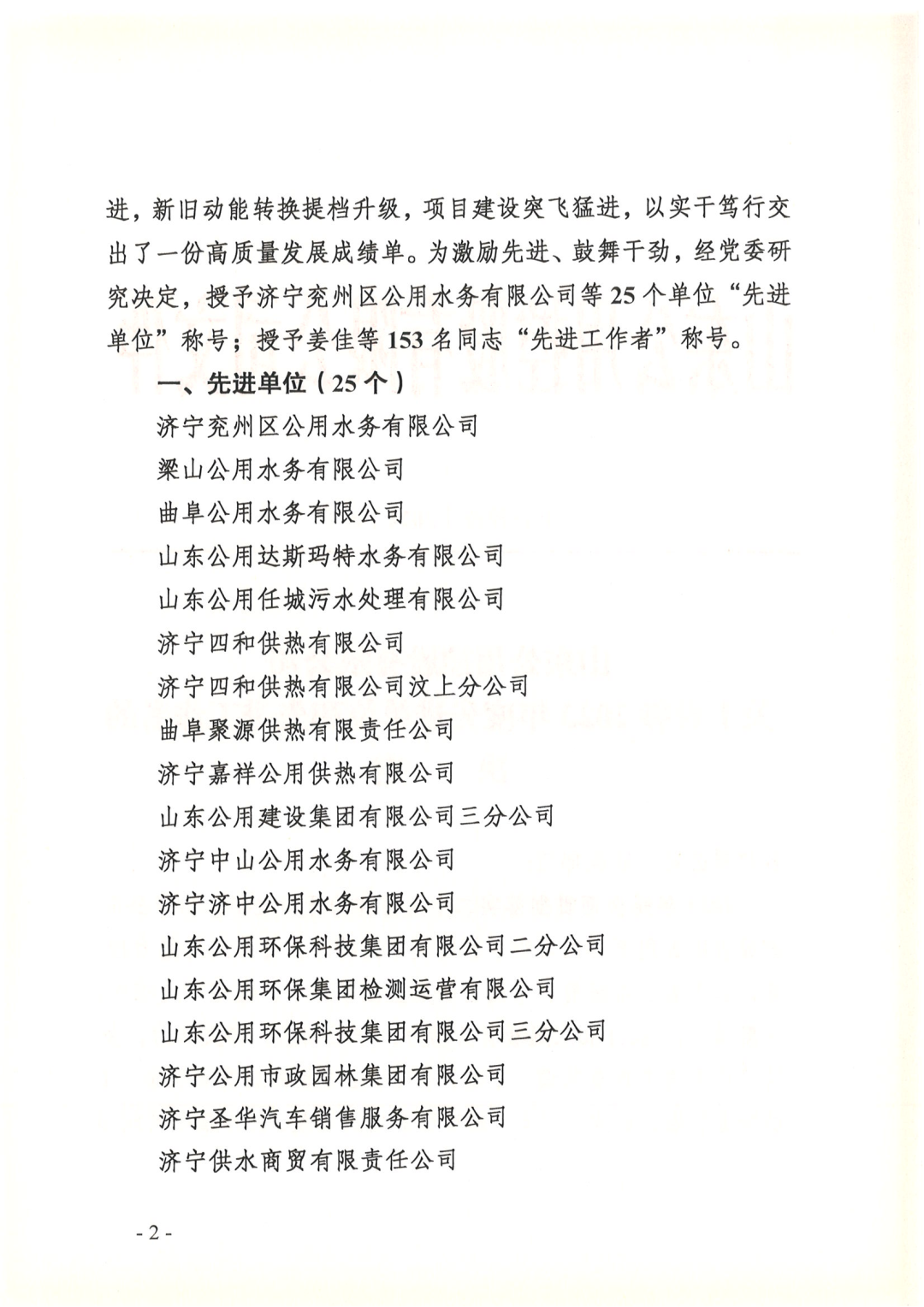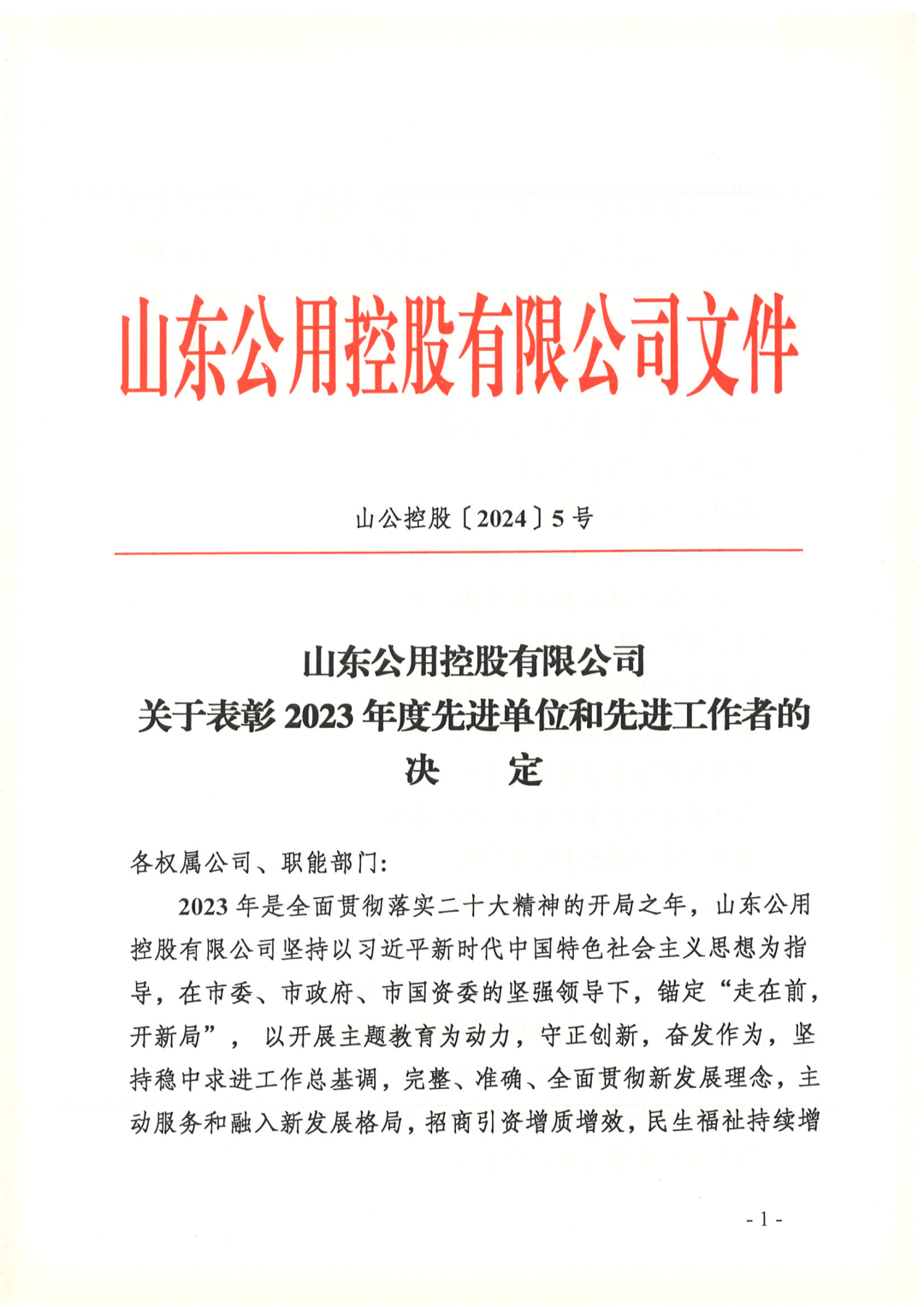 1月19日,山東公用控股有限公司印發(fā)了《山東公用控股有限公司關(guān)于表彰2023年度先進(jìn)單位和先進(jìn)工作者的決定》,商達(dá)公用榮獲2023年度先進(jìn)單位。