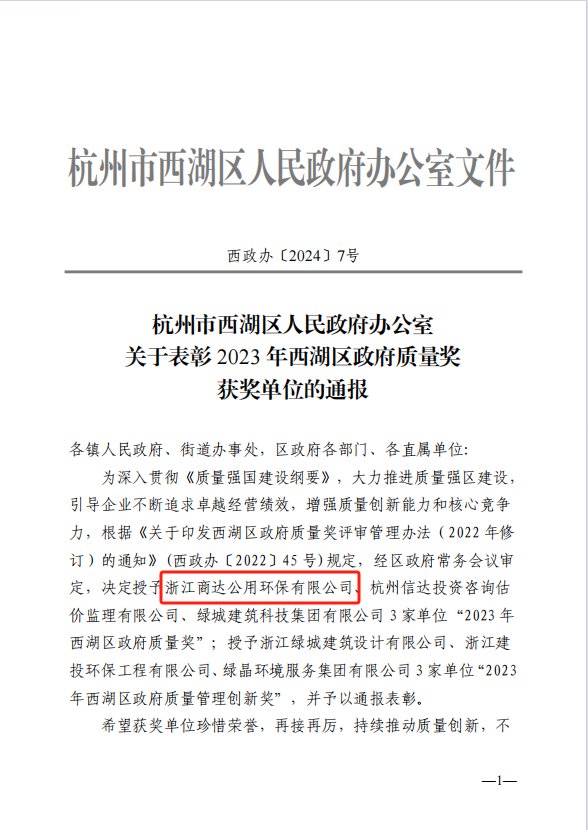近日,杭州市西湖區(qū)人民政府辦公室下發(fā)西政辦[2024]7號文件《杭州市西湖區(qū)人民政府辦公室關(guān)于表彰 2023 年西湖區(qū)政府質(zhì)量獎獲獎單位的通報》,商達(dá)公用榮獲2023年西湖區(qū)政府質(zhì)量獎!