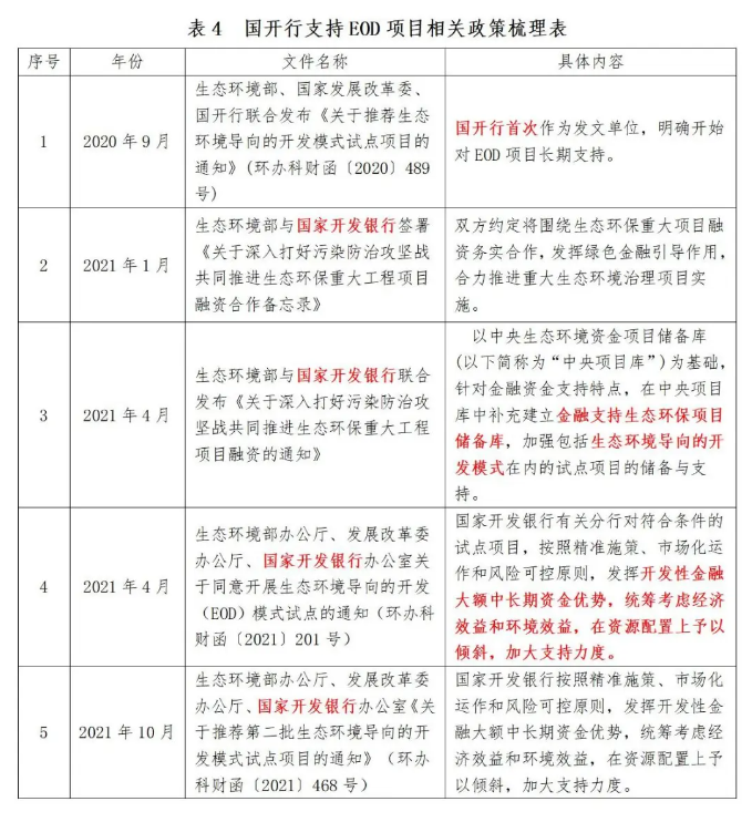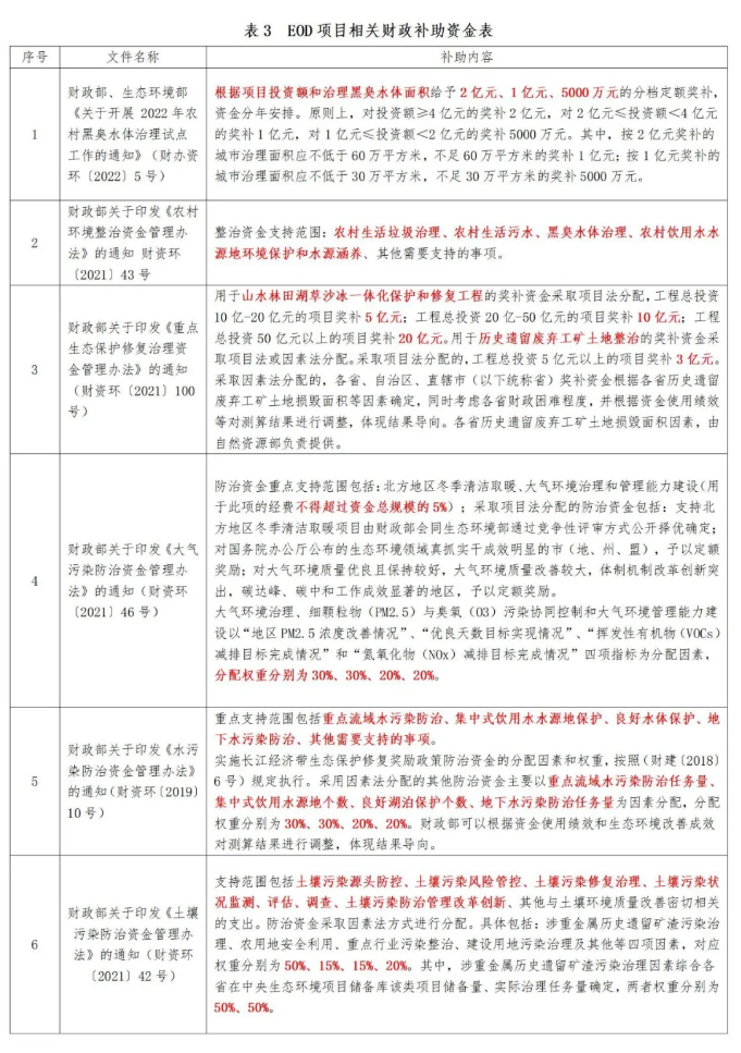 通過梳理我國近年來的政策文件,結(jié)合EOD項(xiàng)目申報(bào)范圍,補(bǔ)助資金的具體內(nèi)容如下表:EOD項(xiàng)目融資資金可通過:政策性銀行融資、商業(yè)銀行融資、政府債券、綠色基金等方式籌集項(xiàng)目資金。其中以政策性銀行融資為主要方式。政策性銀行關(guān)于支持我國EOD項(xiàng)目的相關(guān)政策內(nèi)容整理如下:自2020年與生態(tài)環(huán)境部、國家發(fā)展改革委聯(lián)合推動(dòng)開展生態(tài)環(huán)境導(dǎo)向的開發(fā)模式(EOD)試點(diǎn)工作以來,截至2022年底,國家開發(fā)銀行已向25個(gè)試點(diǎn)項(xiàng)目發(fā)放貸款225億元,涉及水生態(tài)環(huán)境保護(hù)、廢舊資源再生利用、農(nóng)業(yè)農(nóng)村污染治理、生態(tài)保護(hù)修復(fù)等多個(gè)領(lǐng)域。EOD模式是加強(qiáng)生態(tài)環(huán)保投融資、推進(jìn)生態(tài)產(chǎn)業(yè)價(jià)值實(shí)現(xiàn)的重要探索。據(jù)統(tǒng)計(jì),國家開發(fā)銀行支持生態(tài)環(huán)境部EOD試點(diǎn)項(xiàng)目的個(gè)數(shù)、金額均居同業(yè)首位。