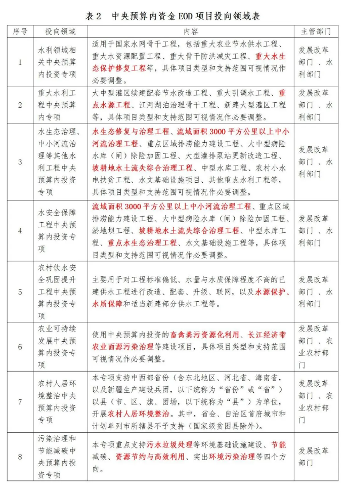 根據(jù)《政府投資條例》,中央預(yù)算內(nèi)投資資金的安排方式包括直接投資、資本金注入、投資補(bǔ)助、貸款貼息等。2020-2022年,中央預(yù)算總盤子投資計(jì)劃分別為6000億、6100億、6400億。2023年,中央預(yù)算內(nèi)資金支持的投向領(lǐng)域有37個(gè),與EOD項(xiàng)目建設(shè)內(nèi)容相契合的有16個(gè),具體見下表: